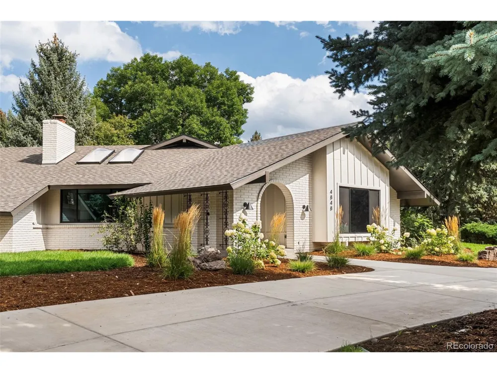 Experience elevated living in this thoughtfully reimagined 4-bedroom, 4-bath ranch-style home, where timeless elegance meets modern design. From the moment you enter, vaulted ceilings and hand-crafted white oak beams set the tone for what is easily one of the most exceptional homes in the neighborhood. The open-concept layout is both functional and refined, grounded by wide-plank engineered hardwood flooring that runs seamlessly through the main and lower levels. Expansive walls and natural light provide an ideal setting for displaying art, creating a home that feels as much like a gallery as it does a retreat. At the heart of the home lies a truly custom kitchen-complete with quartz countertops, custom white oak cabinetry, an oversized island, quartz slab backsplash, and high-end appliances. Just off the kitchen, a moody, fully-equipped butler's pantry adds both character and convenience. Beyond, a hand-troweled plaster fireplace anchors a cozy lounge area, offering a warm, organic touch. The primary suite is a retreat of its own, with a massive custom closet with stackable washer/dryer unit and a striking en suite bath featuring an arched shower entry that nods to the home's subtle Spanish influence. Two additional bedrooms on the main floor provide ample space for family & guests. Downstairs, the finished lower level expands your living space with a secondary family room, a wet bar, a fourth bedroom, a stylish bath, and a stunning laundry room with storage. Step outside to enjoy seamless indoor-outdoor living on the brand-new deck with a built-in gas fireplace. Mature landscaping ensures shade and privacy across the rare 1/3 acre lot, while both a circle driveway and traditional driveway offer abundant parking for guests and golf carts. Around the corner from Boulder Country Club golf course, this home delivers luxury and a lifestyle of convenience. Major upgrades include new AC, baseboard heating system, roof & gutters, windows, and garage door.